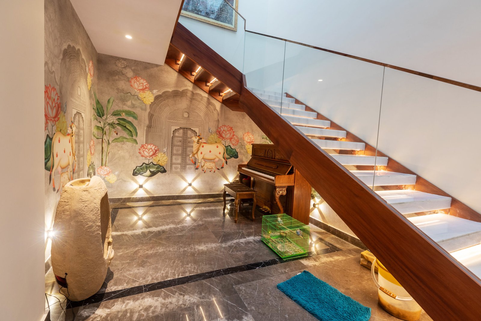 Modern Abode is a home that brings the soul of Benares into the heart of Gurugram. Spread across 18,000 sq ft in the quiet lanes of DLF Phase IV, this residence is a poetic dialogue between cultural heritage and contemporary living. Bespoke teakwood arches reminiscent of Rajasthan forts frame the riaaz area, while paintings of ghats and Tanjore by the homeowner add a deeply personal legacy of Indian artistry. Natural materials—stone, lime plaster, warm wood, cotton, silk, and wool—anchor the design, creating an atmosphere that feels both grounded and luxurious. It is a home where heritage is not preserved as nostalgia but lived in with serenity and belonging